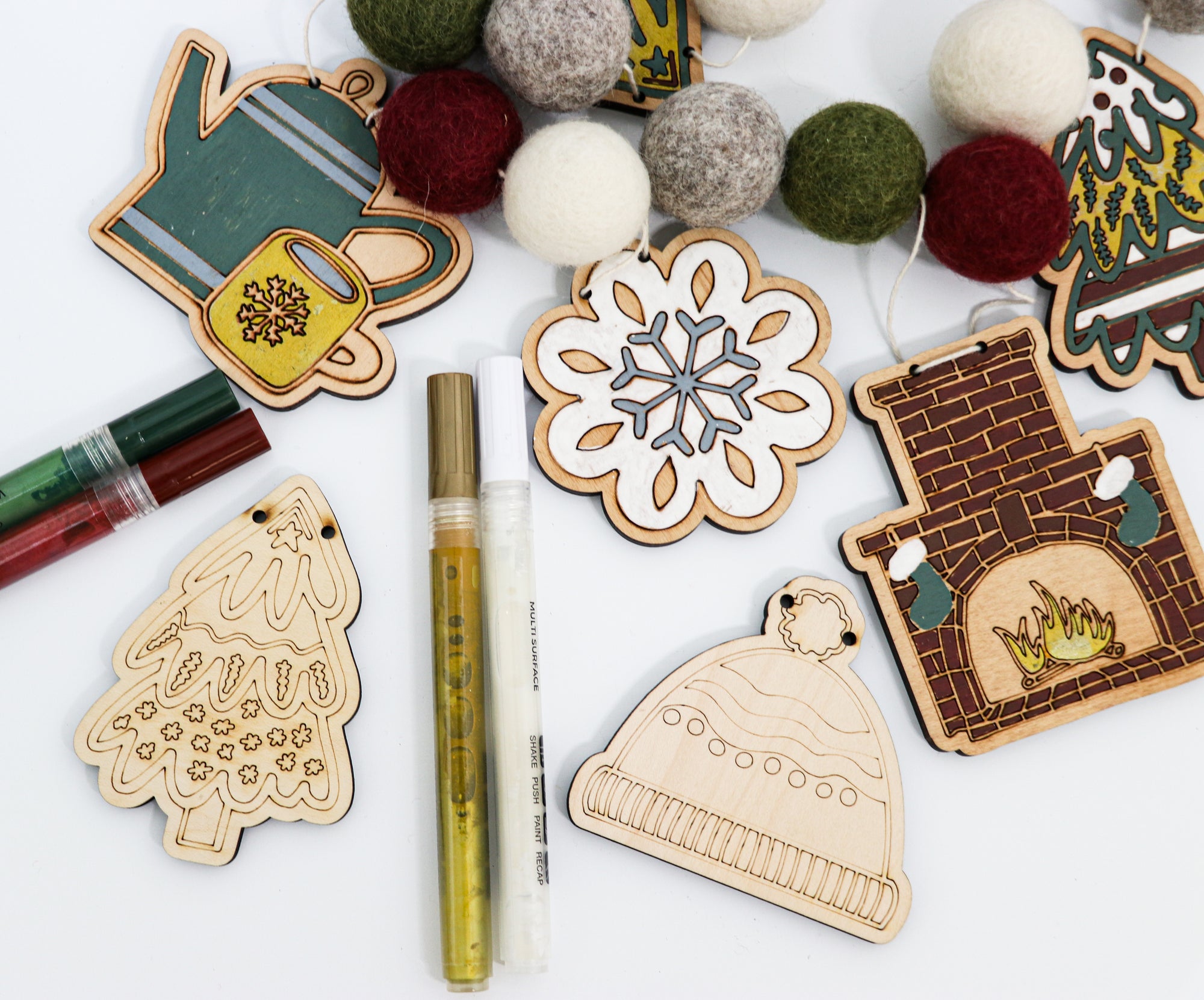 -Custom wood cutouts: 2 Christmas Trees, 2 Snowflakes, Fireplace, Hot Cocoa, Hat, Mittens
